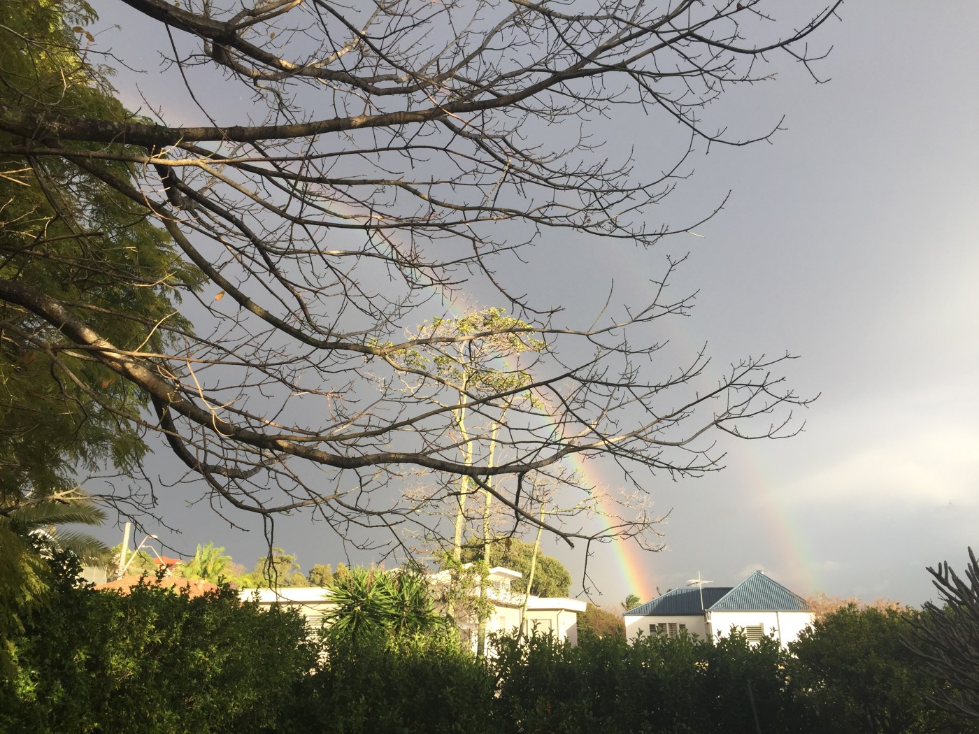 After the funeral, as the congregation left the church we saw an enormous double rainbow arcing across and then plunging into the ocean.
